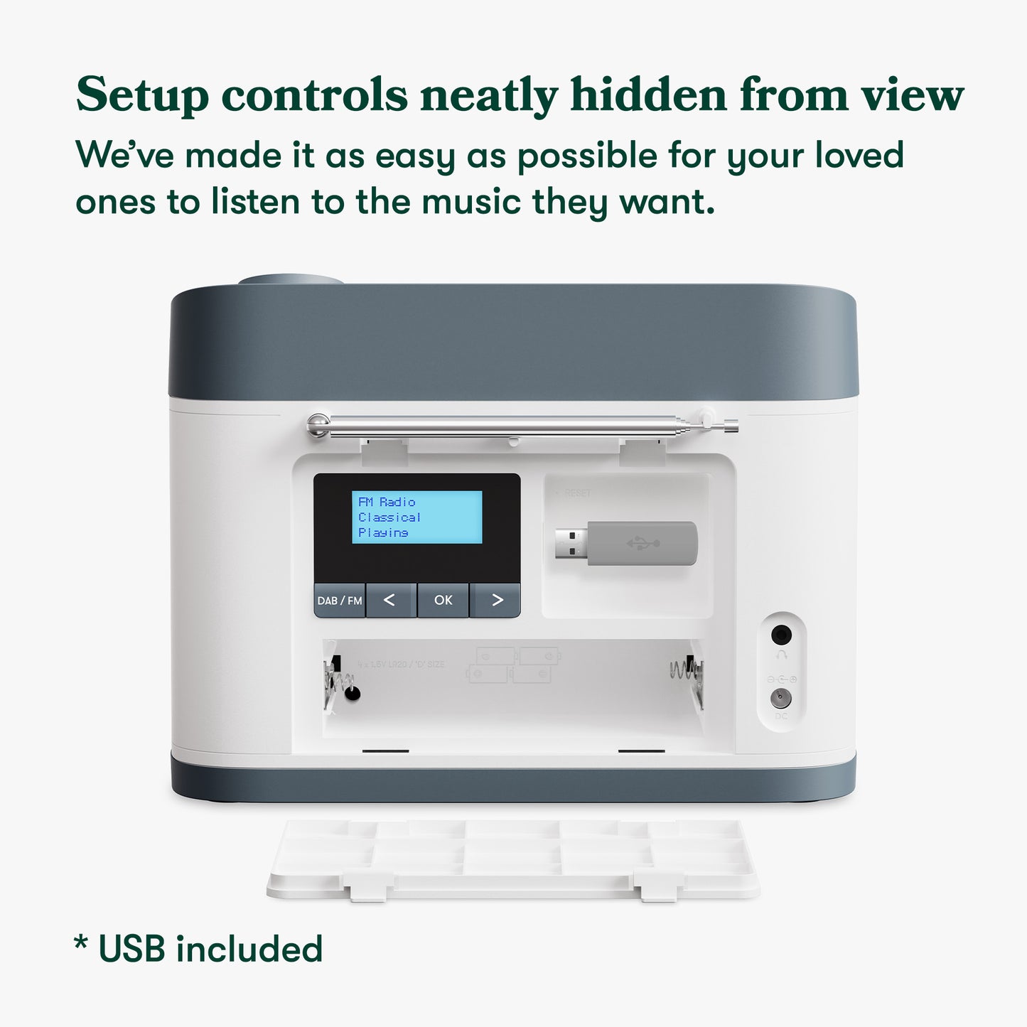 Setup via an interface neatly hidden behind the battery door at the back. Then simply write a name on the front panel that is familiar and understandable to the user, for example ‘Jazz’, ‘News’ or ‘Relaxing’.