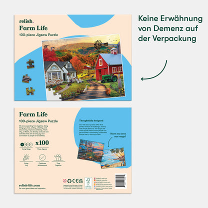 A vibrant farm scene with a red barn, tractor, and autumn trees, ideal for dementia activities like puzzles and reminiscence.|market_au_ca_dk_fi_fr_international_ie_it_nl_pt_es_se_gb_us