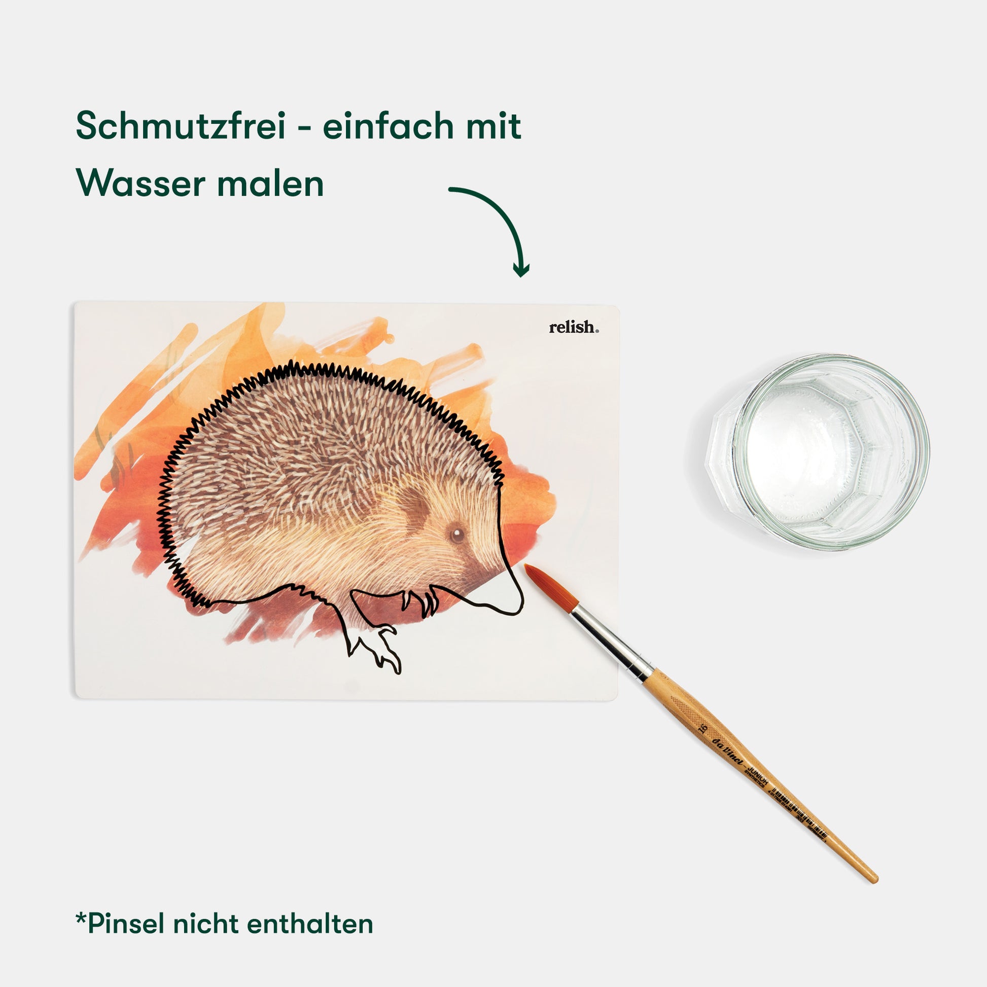 Using just a paintbrush and some water. Dip the paintbrush into the water and brush across the canvas to see it emerge! We recommend using a low dish with a little water to help make it easier to dip the brush and minimise any mess if it is accidentally spilt over.