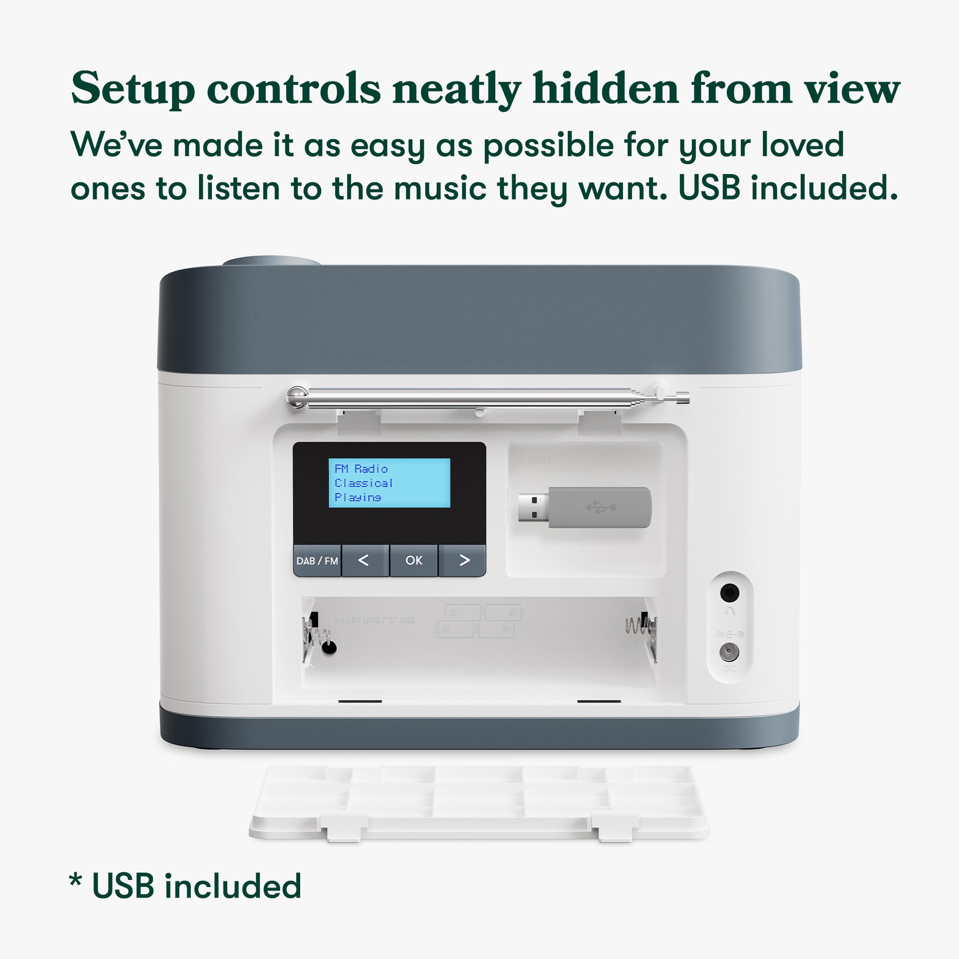 Key settings, including station tuning and playlist loading, are hidden behind a discreet back panel to avoid accidental changes. This ensures the radio stays perfectly tuned, letting users focus on enjoying the music with ease.