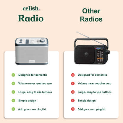 The Relish Radio & Music Player includes a USB port at the back, allowing you to load a personalised playlist of meaningful songs or familiar voices - perfect for creating comforting, memory-filled moments. Simply press the fourth button to play the playlist. A USB stick is included to help you get started right away.
