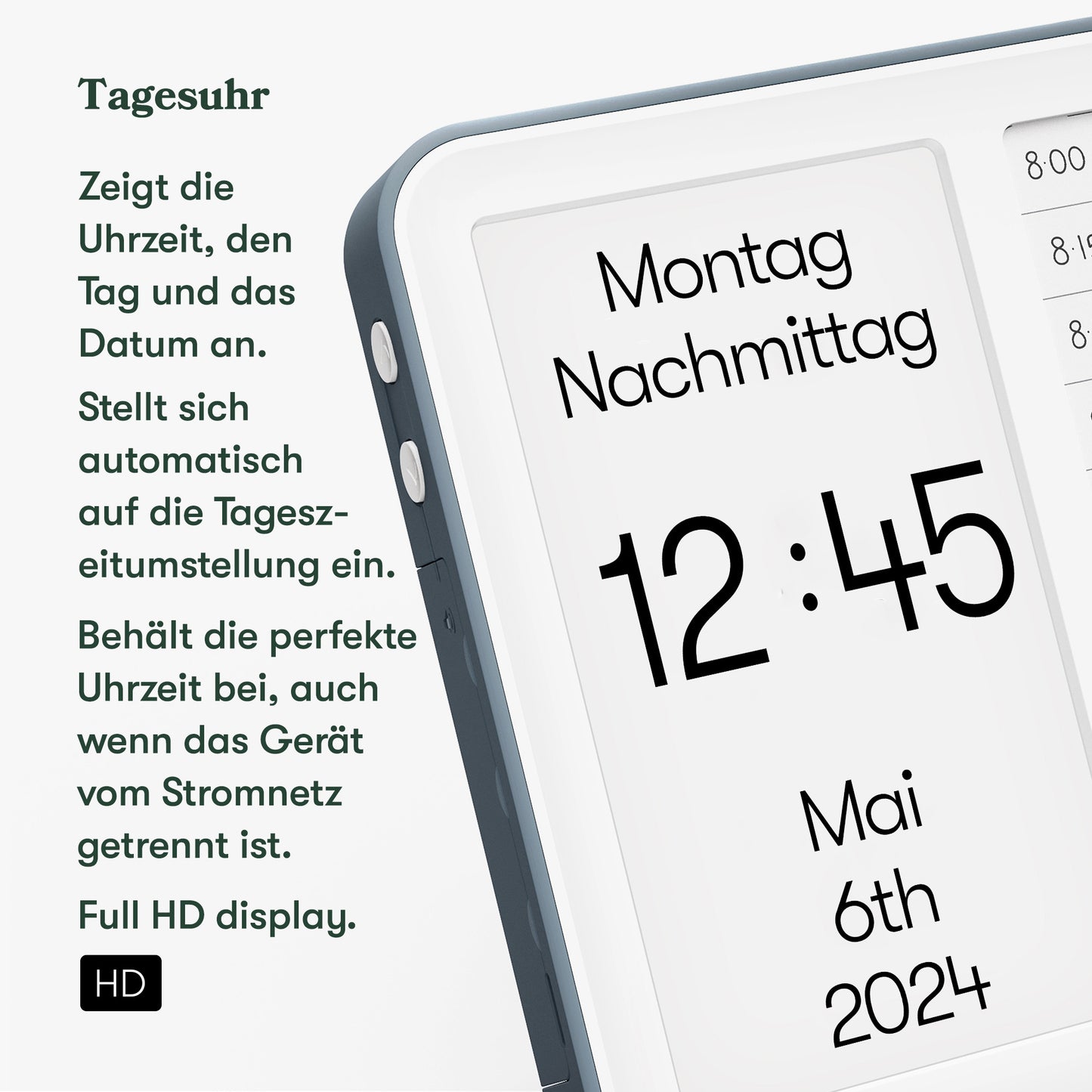 Digital dementia clock with reminders for care home activities, aiding elderly and dementia patients in daily routines.|market_au_ca_dk_fi_fr_international_ie_it_nl_pt_es_se_gb_us