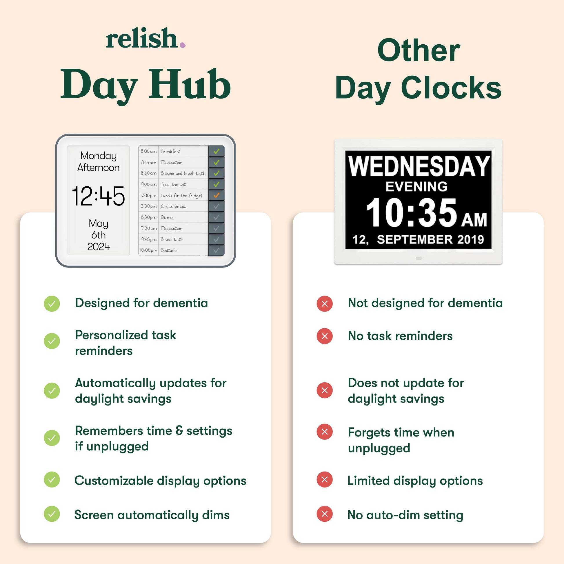 Pair with a Relish Day Connect™ and get Task Alerts in multiple rooms across your home. Can connect with or without wifi.