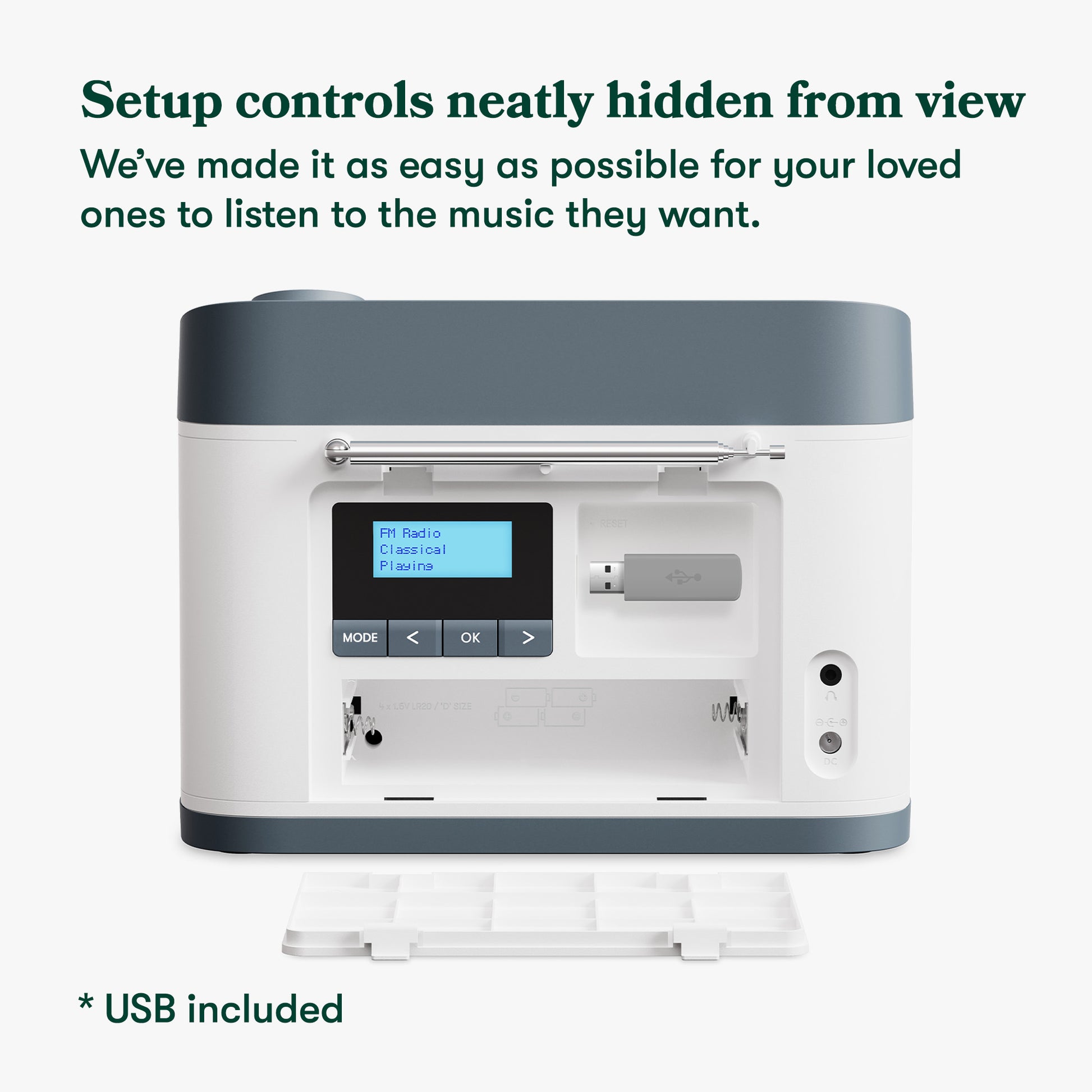 Setup via an interface neatly hidden behind the battery door at the back. Then simply write a name on the front panel that is familiar and understandable to the user, for example ‘Jazz’, ‘News’ or ‘Relaxing’.